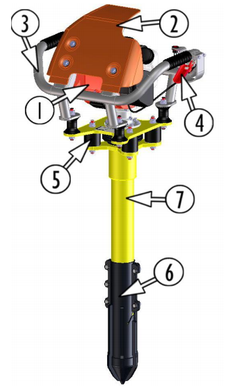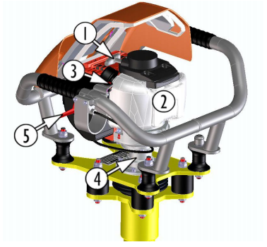 該機采用汽油機與搗固裝置直接連接的設計結構,主要由汽油機、減震裝置、傳動 軸、振動體和扶手組成。汽油機的動力經(jīng)離心式離合器帶動傳動軸組件,傳動軸的下端安裝有一定 質(zhì)量和偏心距的偏心塊,在汽油機的驅(qū)動下產(chǎn)生了的激振力 (離心力) ,當鎬頭接觸道床石砟時鎬 頭周圍石碴也參加振動并產(chǎn)生一定范圍的流動,在下插力和振動力的共同作用下使枕木下石砟均勻流動、重新排列,達到搗固的目的。